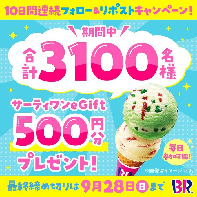 サーティワンアイスクリームで3100名にeGift500円分プレゼントキャンペーン開催中。アイス好きは急げ